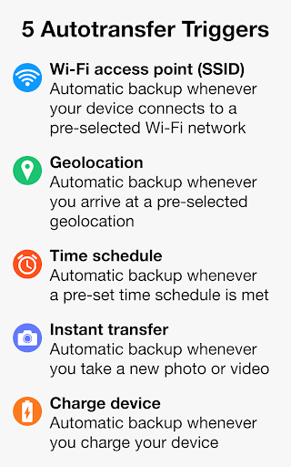 PhotoSync Autotransfer Add-On stands out with its comprehensive set of features tailored for efficient media management Here are five notable features 1 Automatic Wireless Backup - Effortlessly back up photos and videos directly from Android devices to computers NAS or cloud services over WiFi ensuring your files are always safe and accessible 2 Five Autotransfer Triggers - Choose from instant transfer upon capturing media WiFi-based transfer location-based transfer device charging trigger or scheduled time-based transfer providing flexibility in managing backups 3 Cross-Platform Compatibility - Seamlessly integrates with Android iOS Windows and Mac systems offering a versatile solution for users with multiple devices 4 Ad-Free Experience - Removing ads from the free version creates a cleaner and more focused user interface enhancing overall usability 5 Enhanced Security Options - Safely upload files to any NAS wireless storage or remote server using protocols like SMB SFTP or WebDav giving users peace of mind about their data security