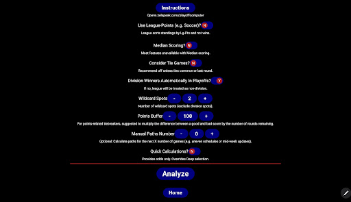 PlayoffComputer offers a robust set of tools for analyzing sports league playoff races Its strengths lie in its comprehensive data import capabilities customizable tiebreaker settings and advanced calculation methods such as paths-to-clinch and detailed team reports These features make it an invaluable resource for fantasy sports players and league managers However the app does come with some drawbacks The computational demands are significant requiring substantial device resources and potentially extended processing times Additionally while efforts have been made to ensure compatibility with various league rules there may be instances where discrepancies occur due to undisclosed methods by hosting sites Furthermore reliance on third-party APIs means future access to data cannot be guaranteed Despite these limitations PlayoffComputer remains a powerful tool for gaining deep insights into sports league dynamics and making strategic decisions