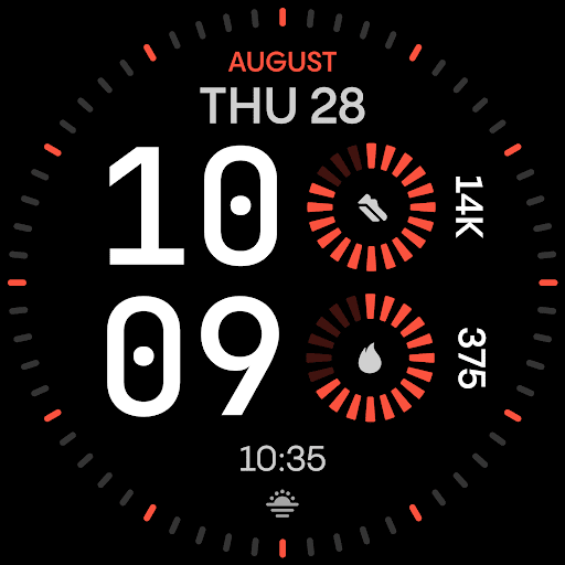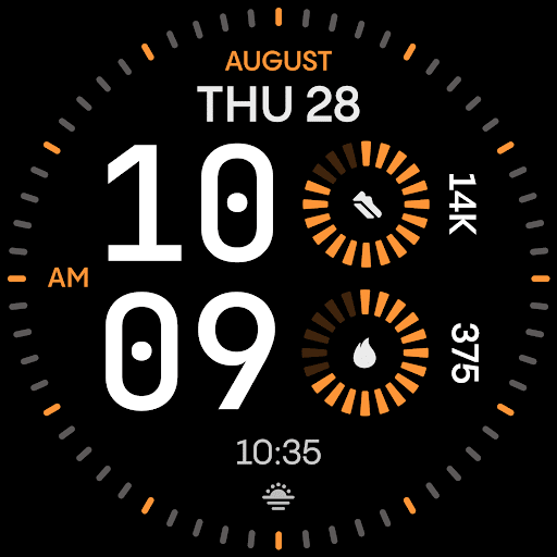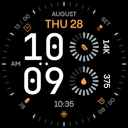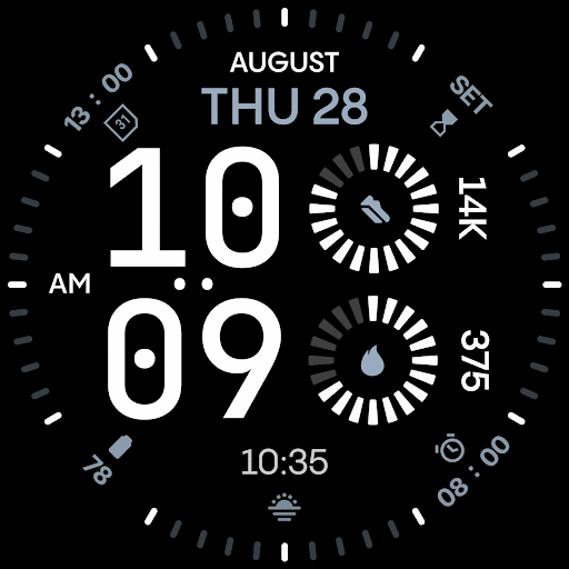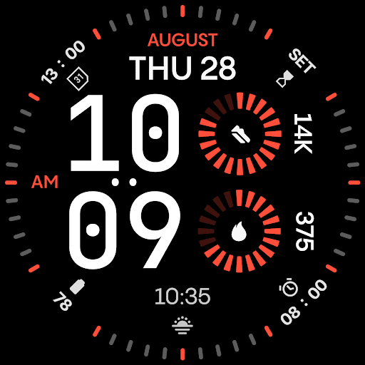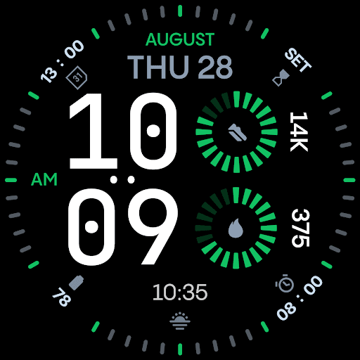 Renn Digital Watch Face is a modern digital watch face designed specifically for Wear OS smartwatches offering users an impactful visual identity with ultra-clear legibility The design combines bold geometric numerals with precise outer dials and radial progress complications to create a dynamic yet functional display It features 7 customizable complications allowing users to display key stats such as steps heart rate or weather information in a clear format With 30 bold color themes optional tic marks and 5 Always-On Display modes users can personalize their experience while maintaining optimal readability Built using the latest Watch Face File format Renn Digital ensures smooth performance and energy efficiency making it suitable for both everyday use and specific activities like workouts or professional settings Overall this watch face delivers a perfect balance of style functionality and personalization catering to users who value clarity and modern aesthetics in their smartwatch experience