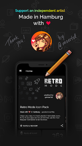 Retro Mode - Icon Pack (Neon) is a pixel art icon pack designed by Moertel, a pixel artist based in Hamburg. This app offers over 4050 pixel-perfect icons with a crisp neon design that takes users on a digital journey back to the vibrant aesthetics of the 90s. The pack includes 12 wallpapers and 6 widgets such as digital and analog clocks, date displays, greetings, calendar, and text shortcuts. It supports more than 20 launchers and requires specific launchers for certain devices like Google Pixel and Samsung. Icons are updated monthly ensuring fresh content regularly. With its unique retro-neon style, absence of shadows and outlines, and customizable widgets, this icon pack provides an engaging way to personalize smartphones. Suitable for those who appreciate pixel art and nostalgia, it brings both functionality and aesthetic pleasure to users' devices.