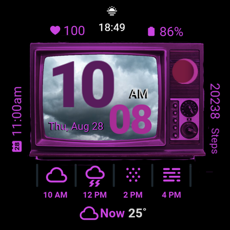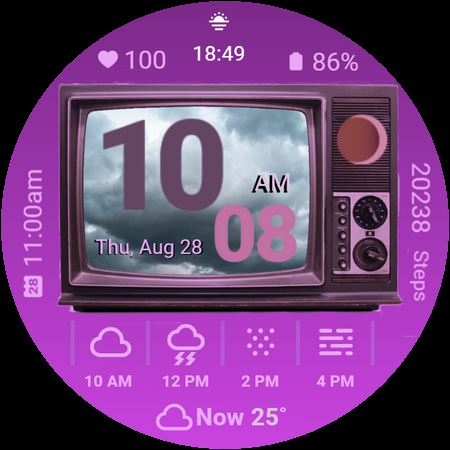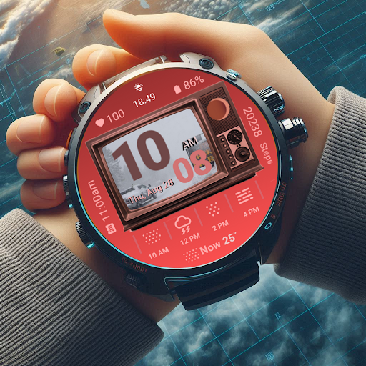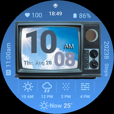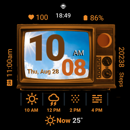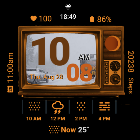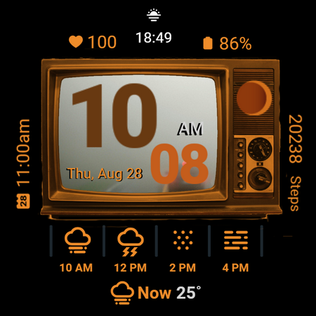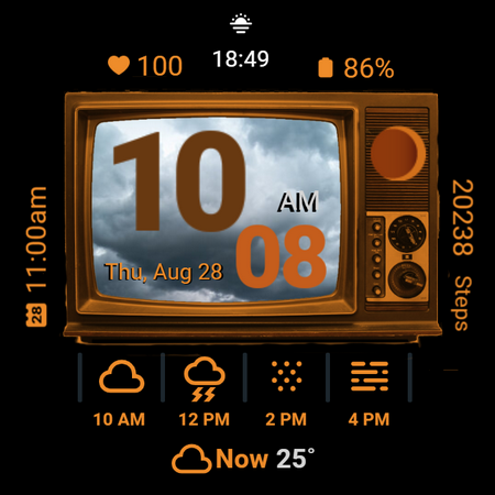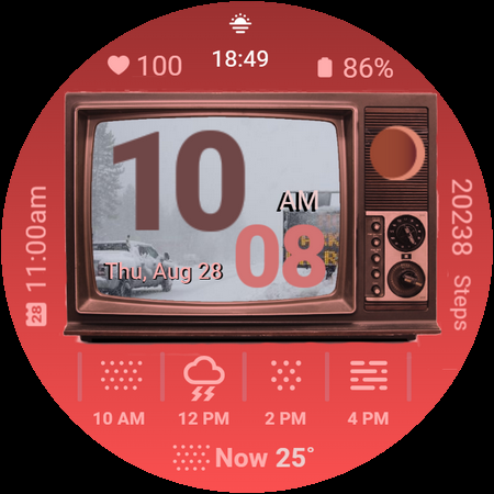Retro Weather TV Watch Face stands out with its blend of vintage appeal and modern functionality Here are five notable features 1 Retro TV Display - The watch face mimics a classic television set providing a unique visual experience with its nostalgic design 2 Weather Photo Display - This feature creatively presents current weather conditions through representative images on the virtual TV screen 3 Health Monitoring Suite - Track your fitness journey with integrated step counter heart rate monitor and next event reminders all within the retro display 4 Customizable Interface - Personalize your watch face with adjustable colors and multiple display options including time format and additional metrics 5 Smart Shortcuts - Access frequently used functions quickly with dedicated buttons for settings and calendar enhancing user convenience