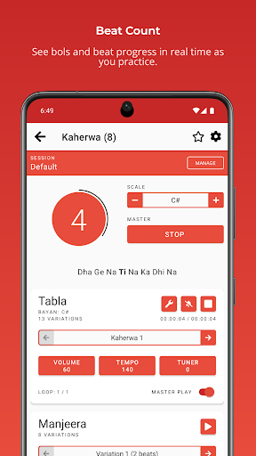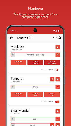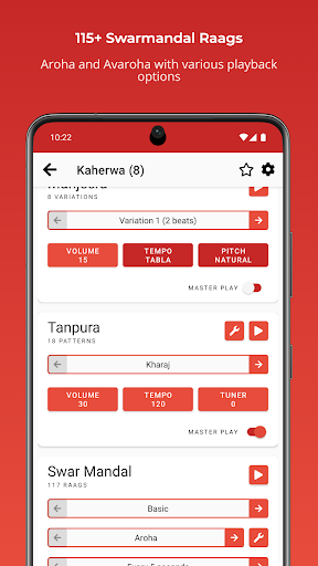 Rhythm Tabla & Tanpura PREMIUM offers a rich set of features that enhance the practice and performance of Indian classical music Here are five notable features 1 Extensive Taal Library - With over 60 tabla taals ranging from traditional to rare patterns users can explore diverse rhythmic structures 2 Customizable Instrument Settings - Each instrument comes with individual controls for pitch volume and tempo allowing musicians to tailor the sound to their specific needs 3 Swarmandal with Raag Support - Featuring more than 115 raags the swarmandal component helps vocalists practice aroha and avaroha with adjustable playback settings 4 Beat Counter with Progress Tracking - This feature highlights tabla bols in a karaoke style providing visual cues for learners and helping them track their progress effectively 5 Session Management System - Users can save and load their favorite setups making it easy to switch between different practice routines or performances