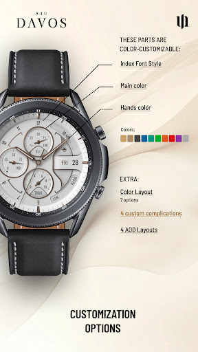 S4U Davos stands out with its extensive customization capabilities Here are five notable features 1 Customizable Design Options - Users can personalize their watch face with 10 main colors 10 hand colors and various layout styles allowing for a unique appearance tailored to individual preferences 2 Editable Complications - With four user-configurable complications wearers can display the most relevant information such as daily steps or heart rate directly on their watch face 3 App Shortcuts - Three editable app shortcuts provide quick access to favorite widgets streamlining daily tasks and interactions 4 Always-On Display Functionality - This feature offers continuous timekeeping with two distinctive layouts ensuring time is always visible while adapting to ambient light conditions 5 Comprehensive Compatibility - Supporting Wear OS 4 and above the app works seamlessly with popular smartwatch models including Samsung Galaxy Watch and Google Pixel Watch series