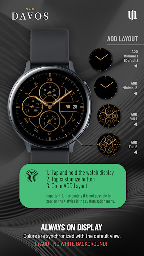 S4U Davos brings a perfect mix of luxury and utility to Wear OS devices Its elegant design and extensive customization options make it a standout choice for users seeking a personalized smartwatch experience The inclusion of editable complications and app shortcuts enhances practicality while the Always-On Display ensures convenience However the app's compatibility is limited to Wear OS 4 and higher which may exclude some users Additionally the Always-On Display while useful can significantly impact battery life Furthermore the abundance of customization options might be overwhelming for beginners Overall S4U Davos is an excellent option for tech-savvy individuals who value both aesthetics and functionality in their smartwatch faces