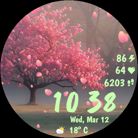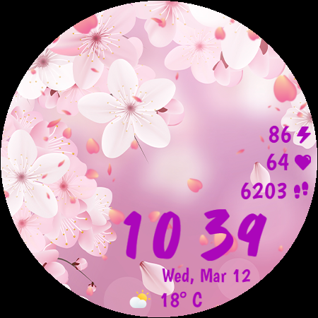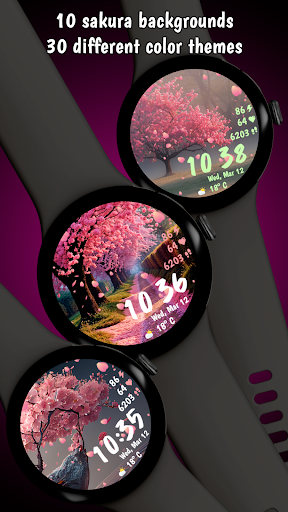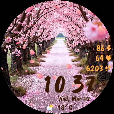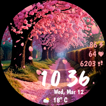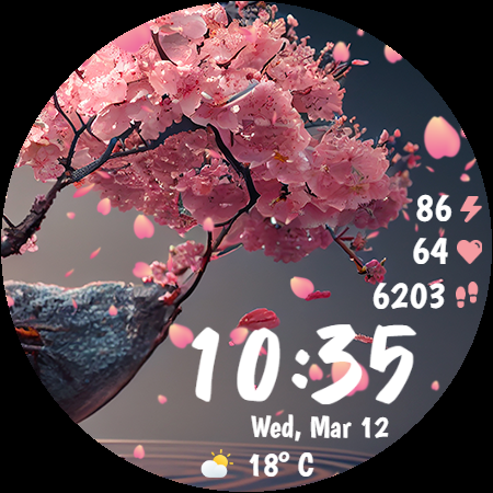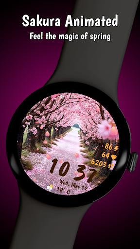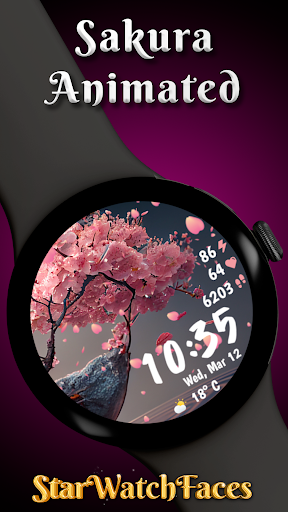 Sakura Animated is a beautifully designed Wear OS watch face that brings the serene beauty of cherry blossoms to your smartwatch. This lifestyle application features mesmerizing animated falling petals and offers 10 breathtaking background options, allowing users to customize their watch's appearance with ease. With 30 color themes available, it ensures a harmonious design that can match any outfit or mood. The app also provides practical functionalities such as heart rate monitoring, step counting, live weather updates in both Celsius and Fahrenheit, and battery percentage display. Its Always-On Display mode is optimized for power consumption, ensuring that users can enjoy the elegant design without compromising on battery life. Compatible with Wear OS devices, Sakura Animated is perfect for those who appreciate both aesthetics and functionality in their wearable technology. Whether you're a nature lover or someone who enjoys customizable tech accessories, this app transforms your smartwatch into an eye-catching accessory while keeping you informed about essential data throughout the day.
