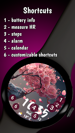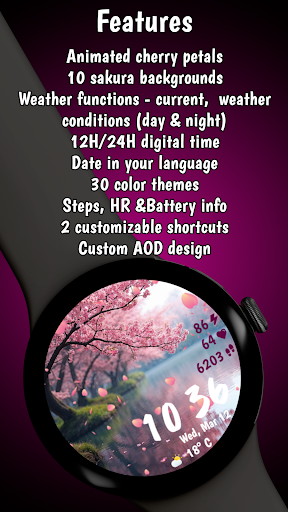 Sakura Animated stands out among other watch faces due to its rich feature set tailored for Wear OS users. Here are five notable features that make this app a top choice 1. Customizable Aesthetics - Users can choose from 10 unique Sakura-inspired backgrounds and 30 color themes, allowing for personalization that matches individual style preferences. 2. Health and Fitness Tracking - Integrated health monitoring tools include heart rate tracking and step counting, helping users maintain an active lifestyle directly from their wrist. 3. Weather Updates - Stay informed about current weather conditions with live updates including temperature readings in both Celsius and Fahrenheit, ensuring preparedness no matter where you go. 4. Battery Optimization - The app includes a Battery-friendly Always-On Display mode which optimizes power usage, providing continuous access to important information without draining the deviceu2019s battery quickly. 5. Productivity Enhancements - Two customizable complications enable quick access to favorite apps or contacts, streamlining daily tasks and boosting overall productivity right from your watch face.