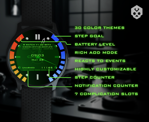 Secret Service Watch Face is a sophisticated Wear OS watch face designed for users who appreciate both elegance and futuristic sci-fi aesthetics. This native standalone application offers an extensive range of customization options, making it compatible with various smartwatches including Samsung, Mobvoi Ticwatch, Fossil, Oppo, and the latest Xiaomi models. The watch face stands out with its unique handcrafted design that ensures individuality. It features 30 color schemes, numerous customizations, reactive elements to low battery and notifications, and 7 customizable complications in different sizes. Additionally, it includes an easy-to-use companion app for installation and management. Overall, Secret Service Watch Face provides a stylish and highly personalized experience for tech-savvy users seeking a distinctive smartwatch appearance.