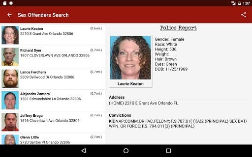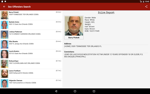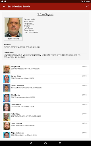 Sex Offenders Search offers a wide array of features that make it an indispensable safety tool. Here are five notable features 1 Comprehensive Search Options - Users can search for offenders using multiple criteria including current location any map point address city zip code offender name or contacts list addresses offering unparalleled flexibility. 2 Daily Updated Database - The app's offender database is updated every day ensuring users have access to the latest information available. 3 Interactive Map Functionality - The interactive map allows users to navigate seamlessly between locations while displaying offender details directly on the map interface. 4 Unique Name Search Capability - Unlike other apps Sex Offenders Search lets users find offenders by name adding an extra layer of search specificity. 5 Optimized User Experience - The app is optimized for all tablet screen sizes supports SD card installation and provides both map and list views with offender photos for easy identification.