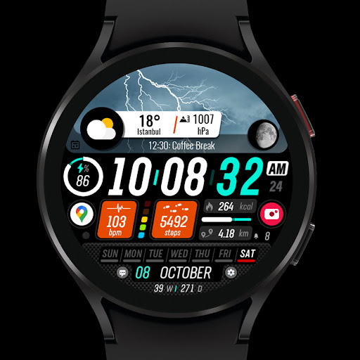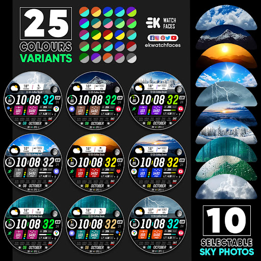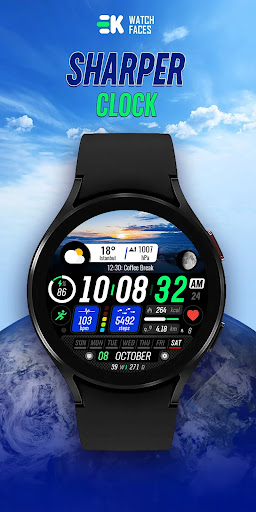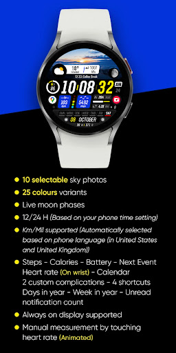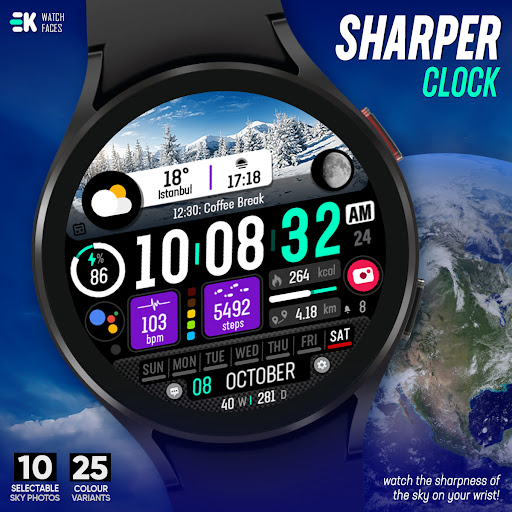 Sharper Clock - Watch Face is a popular app with a ton of features and customization options. Here are five of our favorites 1 Stunning Sky Photos - Choose from ten breathtaking sky photographs that serve as the background for your watch face adding a touch of natural beauty to your device. 2 Color Variants - With twenty-five different color schemes available you can personalize your watch face to match your mood or outfit making each day feel fresh and new. 3 Live Moon Phases - Stay connected to the lunar cycle with real-time moon phase updates displayed directly on your watch face perfect for astronomy enthusiasts or night owls. 4 Health and Activity Tracking - Monitor your daily progress with integrated step counting calorie tracking and heart rate monitoring all accessible right from your wrist. 5 Custom Complications and Shortcuts - Enhance productivity by setting up two custom complications and four shortcuts allowing quick access to frequently used apps or information without having to navigate away from the main screen.