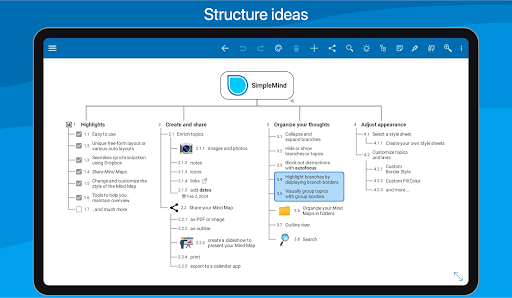 SimpleMind Pro stands out with its rich set of features tailored for efficient mind mapping. Here are five key highlights: 1. Flexible Layout Options - Users can place topics freely or utilize auto layout for brainstorming sessions, allowing for dynamic reorganization through drag, rotate, and reconnect actions. 2. Media Integration - Incorporate images, notes, icons, links, voice memos, and videos into your mind maps, enriching the content and context. 3. Cross-Platform Synchronization - Sync your mind maps effortlessly with Dropbox, ensuring consistency and accessibility across Android, Windows, and Mac devices. 4. Sharing Capabilities - Export your mind maps as PDFs, images, outlines, or even create slideshows for presentations, facilitating collaboration and communication. 5. Customizable Styling - Modify every aspect of your mind map's appearance with over 15 style sheets or create custom ones, giving you complete control over colors, borders, lines, and more.