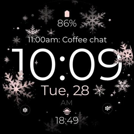 Snowflake Rose Gold is a modern and sleek digital watch face designed for Wear OS smartwatches. This application offers users an innovative GYRO effect that makes snowflakes move as they shift their wrist, creating a captivating visual experience. The design combines silver and rose gold snowflakes, which can be customized to match personal preferences. Snowflake Rose Gold includes practical features such as day and date display, two custom app shortcuts, three custom complications, changeable colors, and Always-On Display (AOD) functionality. Compatible with all Wear OS devices running API 33 and above, including popular models like Google Pixel Watch and Samsung Galaxy Watch series, this watch face brings both style and utility to users' wrists. It is important to note that the design is not suitable for rectangular watches. With options for customization and support available via email, Snowflake Rose Gold provides a versatile and visually appealing solution for smartwatch users seeking a blend of aesthetics and functionality.
