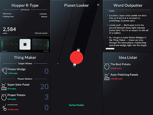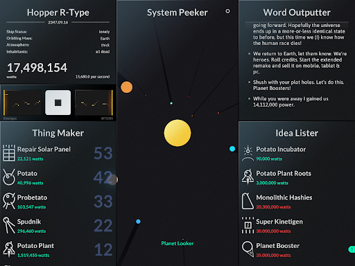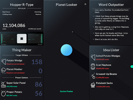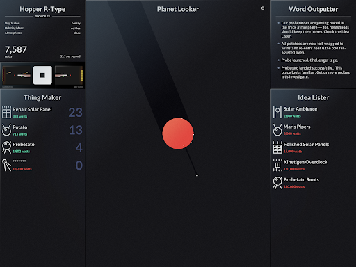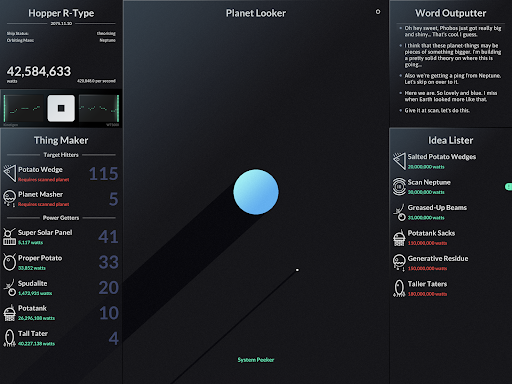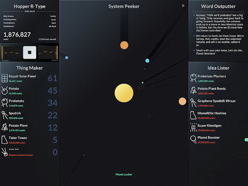 SPACEPLAN is an experimental interactive simulation game that combines narrative sci-fi elements with clicker mechanics. The game is partly inspired by a humorous take on Stephen Hawking's A Brief History of Time and centers around the concept of creating and launching potato-based devices and probes from a satellite orbiting a mysterious planet. Players use manual clicks and the passage of time to unlock fifteen starchy items which can be launched into space. The game offers two different realities to explore with five unique planets in each reality providing a rich and varied gameplay experience. SPACEPLAN features a captivating yet silly story that helps players kill time while unraveling the mysteries of the galaxy. With its banging soundtrack and engaging gameplay SPACEPLAN has been hailed as the best narrative sci-fi clicker game by the astrophysics community. Whether you're looking for a life affirming story or just a way to pass the time this simulation game is an excellent choice for casual and hardcore gamers alike.