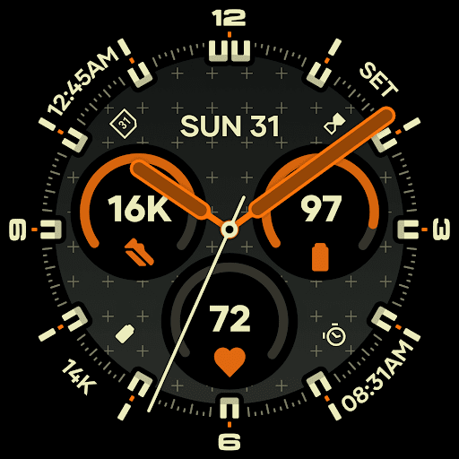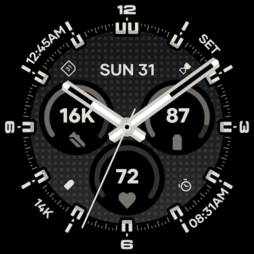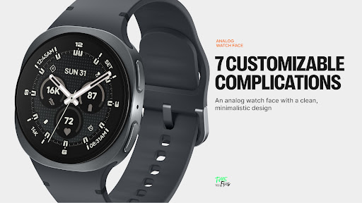 Starlyn Analog Watch Face offers an impressive range of features that cater to both aesthetics and functionality Here are five notable highlights 1 Customizable Complications - Users can personalize their watch face with seven available slots including three core and four peripheral zones integrated seamlessly into the dial design 2 Versatile Color Schemes - Choose from 30 curated options offering both expressive contrast and optimal readability for various lighting conditions 3 Multiple Design Options - Switch between different bezel and hand styles to match personal preferences or suit specific occasions 4 Geometric Background Patterns - Enhance visual depth with two subtle texture options featuring grid and cross designs for added sophistication 5 Advanced Always-on Display - Select from three distinct modes full dimmed or minimal hands-only configurations ensuring visibility while preserving battery life