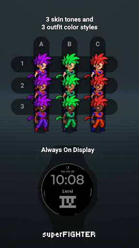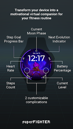 Super Fighter Boy Watch Face is an innovative application designed specifically for Wear OS devices that transforms fitness tracking into an engaging adventure experience Users can train and evolve a virtual warrior character that grows stronger with their physical activity such as step count and heart rate The watch face combines gamified progression with fitness tracking to keep users motivated and engaged through interactive features like leveling up unlocking transformations and achieving higher ranks It also includes vibrant visuals with high quality graphics and fluid animations that bring the hero to life on your wrist Additionally the app integrates with health data providing real time feedback and motivation making it an ideal companion for those looking to stay active while enjoying an immersive experience