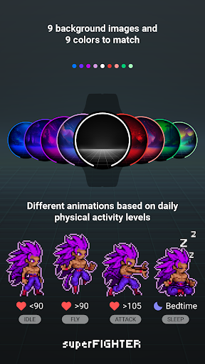 Super Fighter Boy Watch Face offers a wide array of exciting features that make fitness tracking both fun and visually appealing Here are five standout features 1 Train a Warrior - Watch your character evolve from a novice to a legendary fighter as you maintain an active lifestyle Each step and heartbeat contributes to your warrior's growth 2 Gamified Progression - Every movement counts towards advancing to the next level turning daily activities into part of an epic quest 3 Heart Rate Dynamics - Your warrior's animation changes based on your heart rate adding a layer of interactivity and personalization 4 Vibrant Visuals - Enjoy stunning high resolution graphics and smooth animations that make your fitness journey visually captivating 5 Full Moon Transformation - Experience a special transformation when the full moon rises giving your warrior enhanced powers and a unique appearance