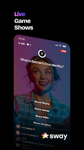 Sway offers a wide range of exciting features designed to enhance user engagement Here are five key highlights 1 Live Game Shows - Participate in real-time interactive game shows hosted by popular creators providing an authentic game show experience 2 Varied Content - Enjoy trivia questions spanning multiple categories including pop culture sports music and memes keeping the content fresh and engaging 3 Real Prizes - Compete to win actual rewards adding an extra layer of excitement and motivation to perform well 4 Personalized Notifications - Get alerts for upcoming shows from your favorite creators ensuring you never miss a live event 5 Social Interaction - Follow creators and engage with a community of like-minded players creating a lively social atmosphere within the app