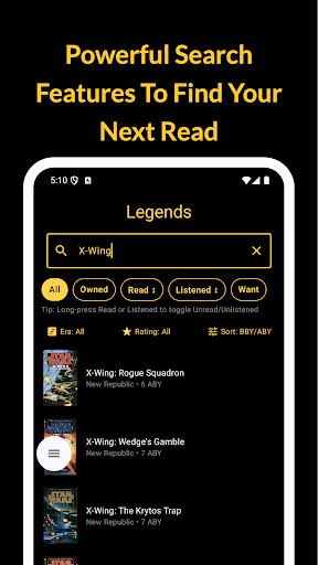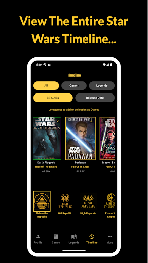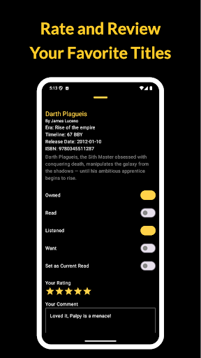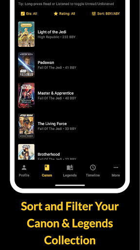 The Cantina Archive is packed with features that cater to Star Wars book enthusiasts. Here are five standout features that make this app a must-have for collectors and readers alike 1. Timeline View - Explore books in chronological order using the BBY/ABY timeline or sort them by release date, providing a clear overview of the Star Wars literary universe. 2. Browse & Search - Easily search for books by title, author, or ISBN, allowing users to quickly discover and manage their collection with precision. 3. Track Your Collection - Toggle titles with different statuses such as Owned, Read, Listened, or Want to Read, giving users a comprehensive way to keep tabs on their reading progress and desires. 4. Currently Reading - Highlight one title as your current read in your profile and track your reading progress, ensuring you never lose your place in the vast Star Wars saga. 5. New Releases - Stay updated with upcoming novels and mark those you're most excited for, keeping your future reading list fresh and exciting.