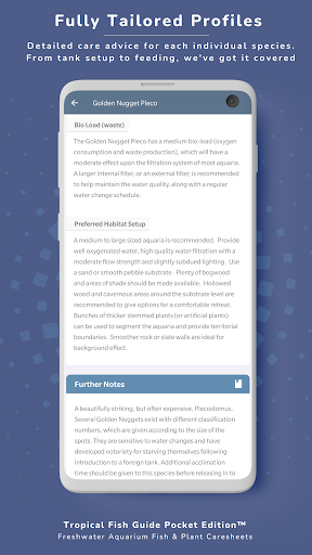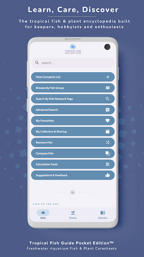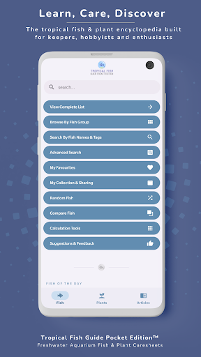 Tropical Fish Guide Pocket Ed is a comprehensive reference application designed for aquarium enthusiasts of all experience levels The app provides detailed care sheets biological data and compatibility information for hundreds of freshwater fish and aquatic plants species Users can access an extensive encyclopaedia featuring A-Z listings of fish and plants complete with images and tailored data The app supports various search methods allowing users to identify species by specific criteria such as size environmental requirements and temperament Additionally it offers per-species recommendations on housing lighting filtration and dietary needs Community forums enable users to ask questions request identifications and engage in discussions with fellow enthusiasts Other notable features include calculation tools for heating and lighting requirements personal note-taking functionality cloud backup and widget integration Available exclusively in English Tropical Fish Guide Pocket Ed serves as an invaluable resource for maintaining a healthy freshwater aquarium environment