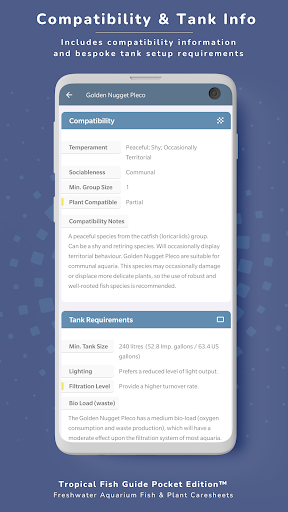 Tropical Fish Guide Pocket Ed stands out with its rich feature set Here are five key highlights 1 Extensive Species Database - The app contains hundreds of detailed profiles covering over 2000 common and scientific names of freshwater fish and plants Each profile includes specific care recommendations and compatibility data 2 Advanced Search Functionality - Users can search species through multiple criteria including size temperament and environmental needs This feature helps aquarists find suitable species for their tanks easily 3 Customizable User Experience - The app allows users to create personal notes on profiles compare species side-by-side and even share their collection with friends These features enhance user engagement and knowledge sharing 4 Practical Calculation Tools - Integrated calculators help determine heating lighting and volume requirements ensuring optimal tank conditions for different species 5 Active Community Support - Through dedicated forums users can ask questions request species identifications and participate in discussions with other aquarium enthusiasts This creates a supportive community for knowledge exchange
