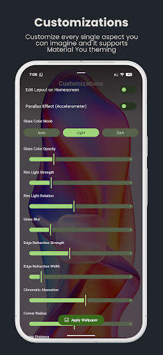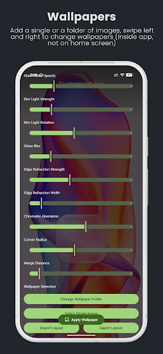 True Liquid Glass offers an impressive array of features that make it stand out among live wallpaper applications Here are five notable characteristics 1 Dual Layout Engine - Users can create completely independent designs for home and lock screens allowing for maximum customization and creativity 2 Advanced Live Editor - The app provides real time editing capabilities enabling users to move resize and adjust shapes directly on their wallpaper with intuitive controls 3 Realistic Glass Effects - Featuring real time refraction chromatic aberration and dynamic rim lighting the app creates authentic frosted glass visuals that respond to device motion 4 Full Customization Suite - With numerous sliders and settings including blur intensity tint color opacity and icon roundness users have granular control over their wallpaper's appearance 5 Preset System and Wallpaper Management - Users can save share and import layouts while also being able to use single images or cycle through entire folders for varied wallpaper experiences