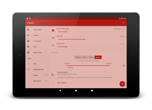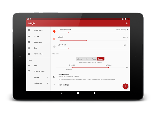 Twilight Pro Unlock is a specialized application designed to help users improve their sleep quality by reducing blue light exposure from their smart devices during evening hours The app addresses the issue of disrupted circadian rhythms caused by prolonged screen time before bedtime by filtering the blue spectrum of light after sunset which can suppress melatonin production and disrupt healthy sleepwake cycles Twilight offers a solution by applying a soft red filter to device screens adjusting its intensity based on local sunset and sunrise times This feature makes it an essential tool for individuals who use their devices late in the evening or for parents concerned about their childrens screen time before bed In addition to basic features the PRO version provides advanced customization options including multiple profiles adjustable transition times and the ability to disable the service during inactive periods making it a versatile choice for managing digital wellness across different devices
