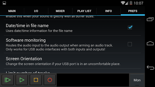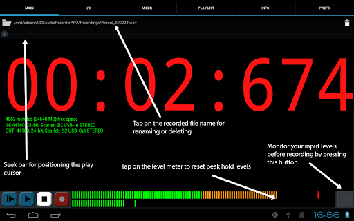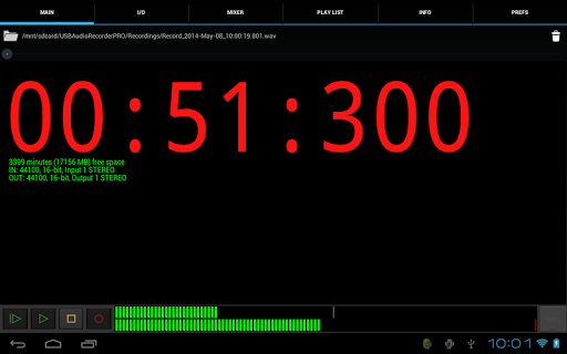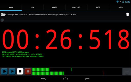 USB Audio Recorder PRO offers an extensive suite of features tailored for audiophiles and professionals alike. Here are five notable highlights: 1. High-Resolution Recording - Capture audio in stunning clarity with support for various bit depths and sample rates up to 384 kHz ensuring professional-grade recordings. 2. Versatile Playback Options - Enjoy stereo playback and choose from multiple output selections while using class-compliant USB audio devices. 3. Flexible Recording Formats - Select from several formats such as WAV FLAC OGG and AIFF allowing users to optimize their recordings based on quality or file size preferences. 4. Comprehensive Level Monitoring - Utilize level meters with peak hold functionality and a monitor button to fine-tune audio levels before recording sessions. 5. Customizable Settings - Adjust buffer sizes select input and output channels and designate specific folders for saving recordings such as external SD cards providing users with enhanced control over their recording environment.