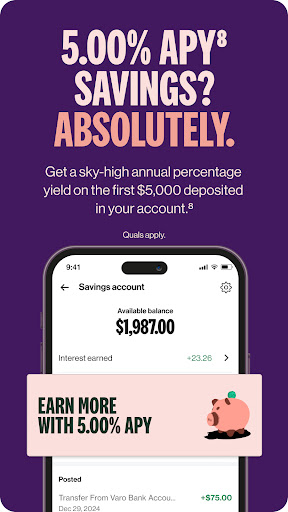 Varo Bank is a digital banking application that offers users a comprehensive suite of financial services. It provides free online banking features including early payday options high yield savings accounts credit score monitoring and automatic cashback rewards. The app also includes tools for easy credit building instant cash advances and personal lines of credit. Available for both Android and iOS devices Varo Bank ensures accessibility and convenience. With its mobile check deposit digital wallet and spending tracking capabilities the app helps users manage their finances effectively while offering competitive APY rates on savings. This makes Varo Bank an excellent choice for those seeking modern banking solutions.
