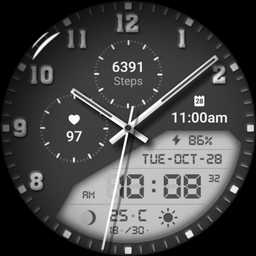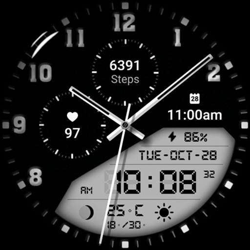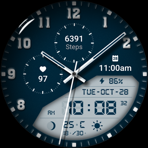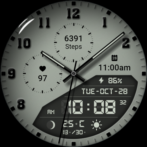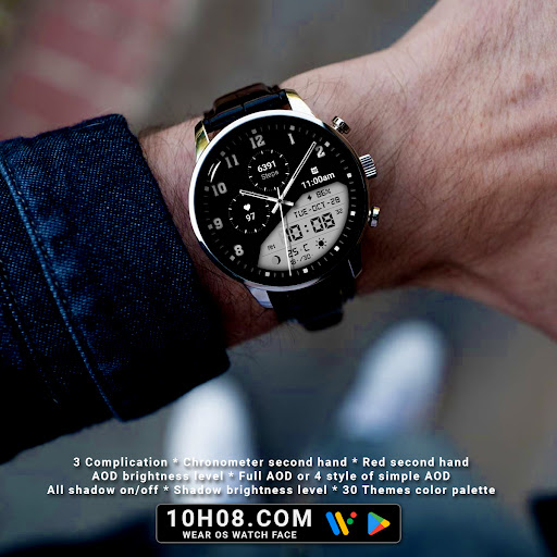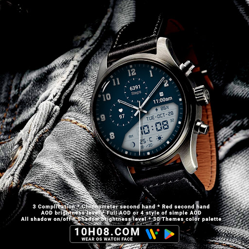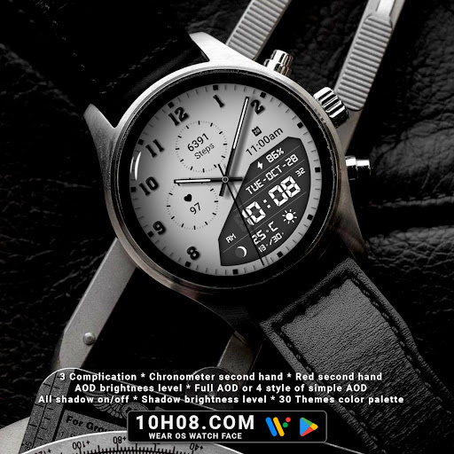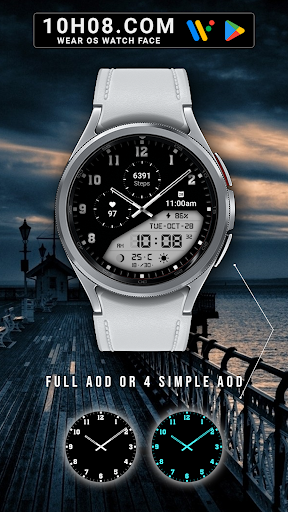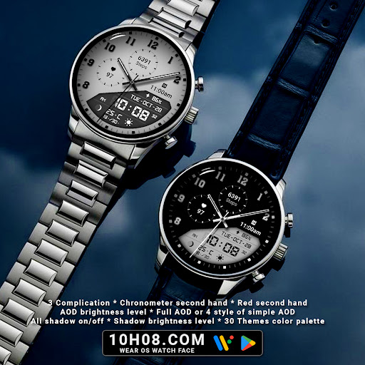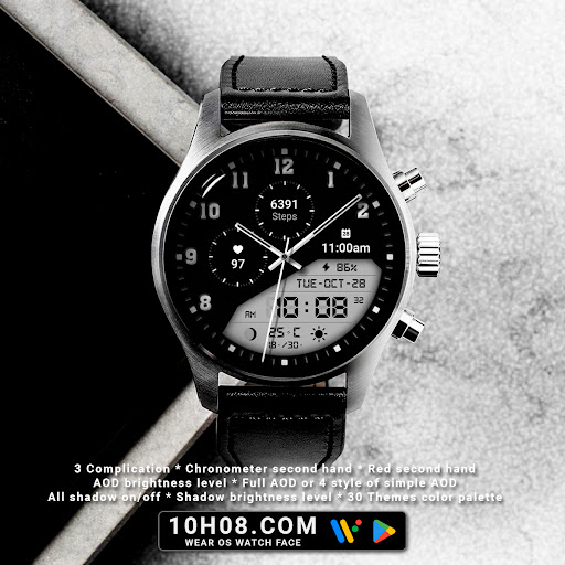 Watch face 10h08.com #85 is a feature-rich application designed specifically for smartwatches running Wear OS 5+ SDK 34+. This digital watch face combines classic aesthetics with modern functionality offering users an enhanced timekeeping experience. The app provides high resolution sharp image quality and includes both analog and digital time displays along with essential information such as day date weather steps count heart rate next event moon phase and battery level. With 30 color themes and customizable complications users can personalize their watch face to suit their preferences. The app supports full AOD or four styles of simple AOD with adjustable brightness levels. Compatible with popular smartwatch models like Galaxy Watch 6 and Ticwatch Pro 5 this versatile application ensures accurate timekeeping and personalized customization options making it an excellent choice for smartwatch users seeking both style and functionality in their wearable devices