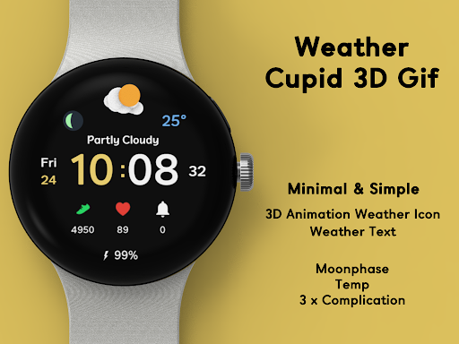 Weather Cupid 3D Gif is a specialized Wear OS watch face application that combines minimalist design with essential weather information. This digital watch face features an intuitive interface complemented by animated 3D weather icons, making it easy for users to check both time and weather conditions at a glance. The app supports key functionalities such as temperature display in Celsius or Fahrenheit, moon phase tracking, multilingual options, 12h/24h time format, and battery percentage indication. Weather data is automatically updated every 30 minutes through Samsung's API, ensuring relatively current information though discrepancies with other providers may occur. Customization options include 18 font color styles, one app shortcut, and three complications. It is important to note that square screen modes are not supported and after restarting the watch, users might need to reapply the watch face for weather info to display correctly. Compatible solely with Wear OS devices, this app enhances user experience by integrating vital weather details into a sleek wearable interface, catering especially to those who prioritize both aesthetics and functionality in their smartwatch displays.