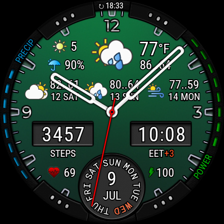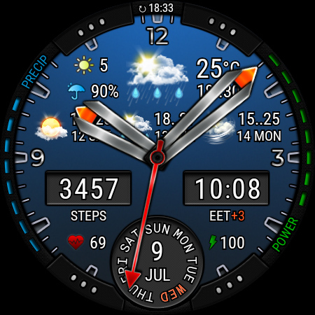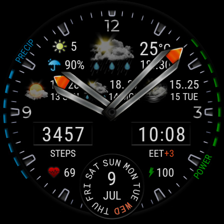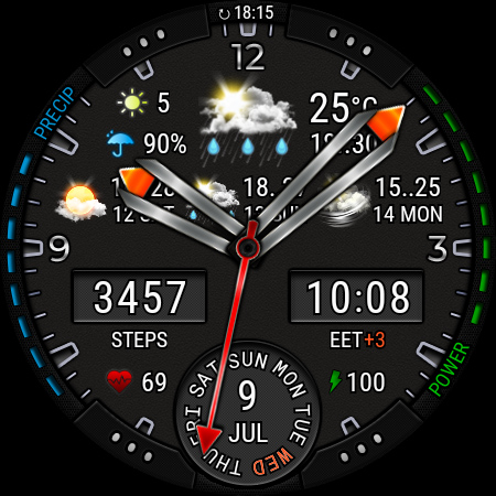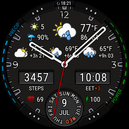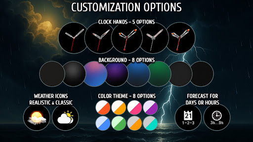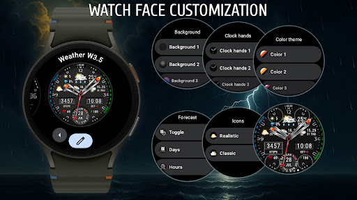 Weather watch face W3.5 offers a rich set of features that cater to various user needs Here are five notable ones 1 Live Weather Updates - Get real-time weather information including temperature precipitation chance and UV index directly on your smartwatch face 2 Customizable Design - Choose from multiple backgrounds color themes and analog hand styles to personalize the look of your watch face according to your preference 3 Comprehensive Forecasting - Access a four-day weather forecast and hourly predictions at three six and nine-hour intervals ensuring you're prepared for upcoming weather changes 4 Health and Device Stats - Monitor essential health metrics like heart rate and steps while also keeping track of your device's battery level and timezone 5 Seamless Integration - Powered by The Weather Channel or your system's default provider this feature guarantees accurate and reliable weather data synchronization