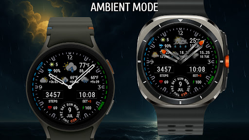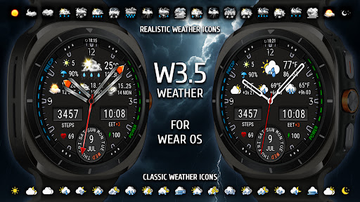 Weather watch face W3.5 is a sophisticated analog watch face designed for smartwatches running Wear OS 5+ offering users an elegant way to track weather conditions health statistics and customize their watch interface The application stands out with its precise design and clarity providing real-time data directly on the user's wrist It features live weather updates a four-day forecast hourly forecasts precipitation chances temperature readings UV index and classic weather icons making it a comprehensive weather tracking tool Compatible with the latest Galaxy Watch and Pixel Watch models this app ensures that users have useful information such as step count heart rate battery level date and timezone at their fingertips through a compact AMOLED optimized layout Weather watch face W3.5 represents a perfect blend of style and functionality allowing users to upgrade their smartwatch experience with both aesthetics and practicality