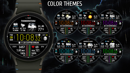 Weather watch face W7.5 is a specialized application designed for Wear OS 5 smartwatches that combines accurate weather forecasting with essential health tracking features This innovative watch face provides users with real-time weather updates including current temperature two-day forecast precipitation probability and UV index all presented through immersive realistic weather icons In addition to its weather capabilities the app also monitors heart rate tracks daily steps and distance traveled making it an all-in-one solution for both lifestyle management and fitness tracking The application supports customization with eight stunning color themes and five quick-launch shortcuts allowing users to personalize their experience and access favorite apps instantly Compatible exclusively with Wear OS 5 and newer versions this app represents a perfect blend of functionality and aesthetics providing users with critical information at a glance and enhancing their smartwatch experience significantly