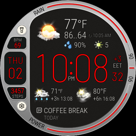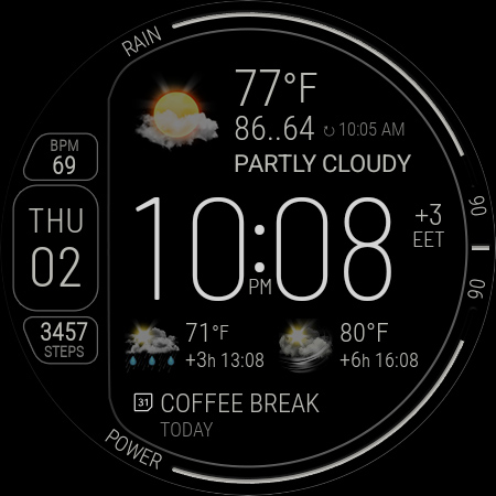 Weather watch face W8.5 is a specialized digital watch face designed for Wear OS 5+ smartwatches offering real-time weather tracking health monitoring and extensive customization options This feature-rich application brings together elegant design elements with practical functionality providing users with essential information at a glance The watch face displays live weather updates including current conditions 2-day forecasts hourly intervals and key metrics like precipitation chance temperature and UV index Alongside weather data it also shows personal health stats such as heart rate and step count plus device information like battery level and date Designed exclusively for Galaxy Watch and Pixel Watch models this app supports multiple color themes display modes and customizable complications ensuring both style and utility With its seamless integration with The Weather Channel and optimized performance on AMOLED screens Weather watch face W8.5 is an excellent tool for users seeking a smartwatch experience that combines aesthetics with informative weather and health tracking capabilities