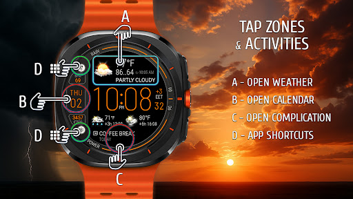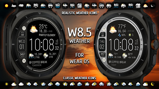 Weather watch face W8.5 offers a comprehensive set of features that enhance the smartwatch experience Here are five notable characteristics 1 Real-Time Weather Updates - Get live weather information directly on your watch face including current temperature forecast for the next two days and detailed hourly predictions for 3 and 6-hour intervals 2 Customizable Display Options - Choose from 8 unique color themes and switch between dark mode for battery savings or bright exclusive mode for better visibility Customize up to 3 complication areas to suit your preferences 3 Health and Fitness Tracking - Monitor essential health metrics such as heart rate and step count helping you maintain an active lifestyle while keeping track of your wellness goals 4 Device Information Integration - View important smartwatch details like battery level date and timezone all within the same intuitive interface designed for quick access and readability 5 User-Friendly Design - Featuring realistic weather icons and a compact layout optimized for AMOLED screens this watch face ensures both aesthetic appeal and functional clarity making it easy to read and interact with throughout the day