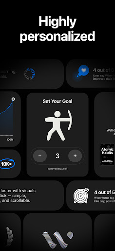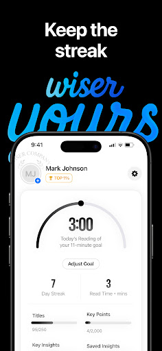 Wiser is packed with features that cater to different learning preferences. Here are five notable ones: 1. Audiobook Functionality - Listen to audible versions of book summaries while commuting or exercising, making learning flexible and accessible anytime, anywhere. 2. Personalized Recommendations - Receive tailored book suggestions based on your personal growth goals, ensuring you find content that resonates with your interests. 3. Customizable Reading Experience - Adjust font sizes, color themes, and other settings to create a comfortable and personalized reading environment suited to your preferences. 4. Spaced Repetition Feature - Maximize information retention and minimize study time using this scientifically-backed method that boosts long-term memorization through repeated exposure. 5. Offline Access - Download summaries and audiobooks directly to your device, allowing you to learn without an internet connection, whether you're traveling or in areas with limited connectivity.